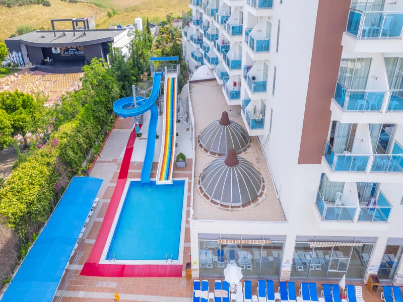 separat barnpool för de minsta samt en sk aqua pool med två vattenrutschkanor