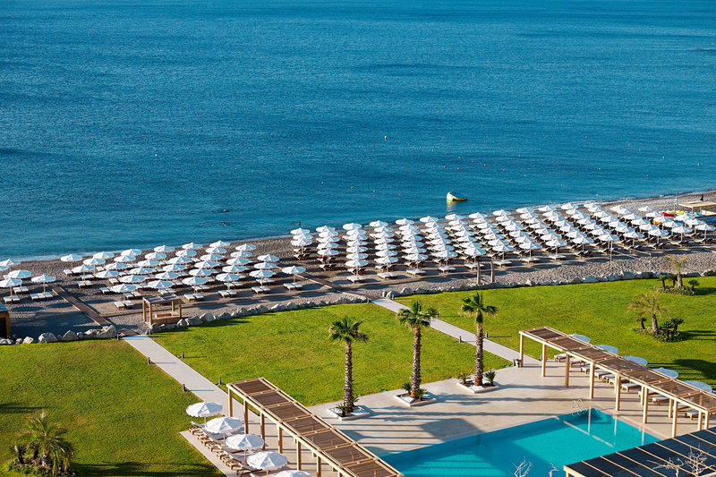 Mitsis Selection Alila ligger precis vid stranden. Den vita byggnaden ser